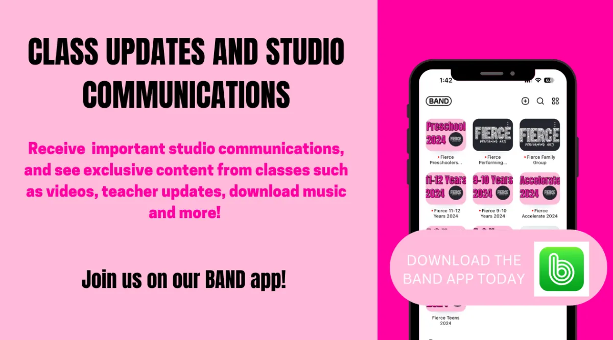 At Fierce Performing Arts, we use the BAND APP so you can receive studio updates, class info, ask questions, and see videos and photos from your Child's classes. We'll post relevant and important class updates as well as showing you what your kids are up to in class, you can also access class music and choreography allowing your child to easily practice their routines at home. Both Parents and students who own a device are welcome to join and the BAND APP can be accessed on smart phones/tablets and computers.